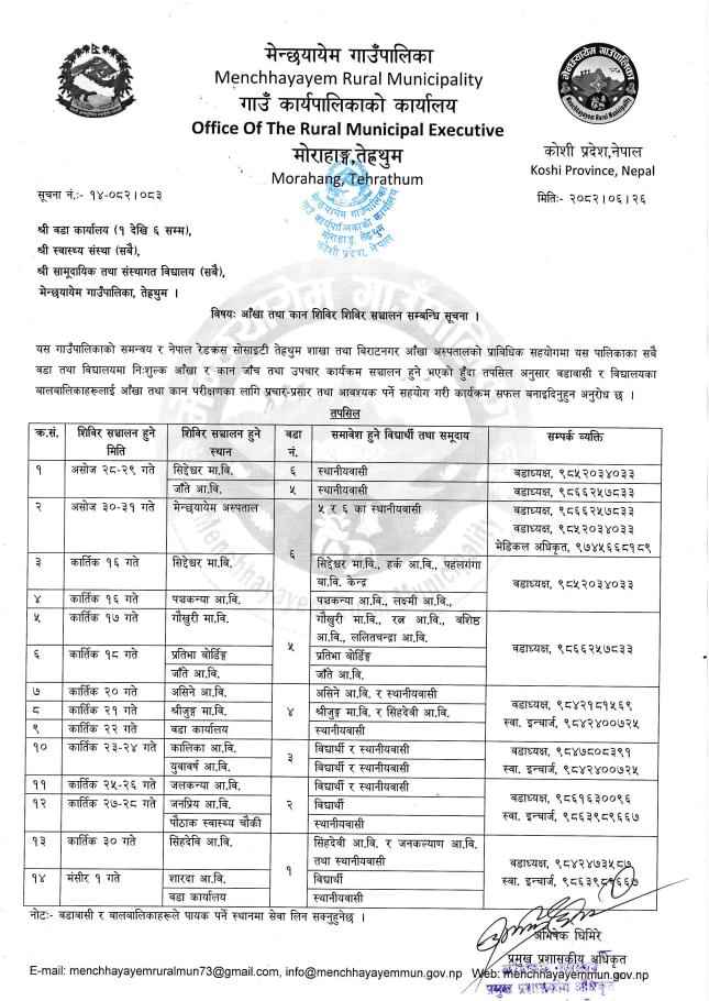 आँखा तथा कान शिविर सञ्चालन सम्बन्धि सूचना ।