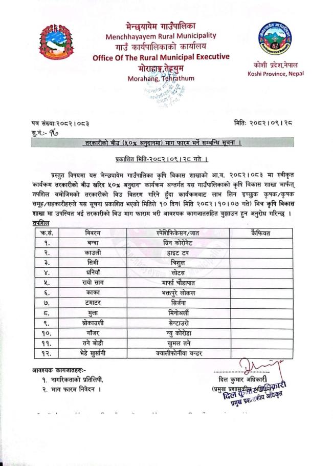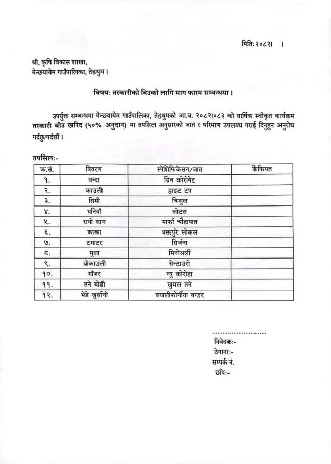 तरकारीको बीउ ५० प्रतिशत अनुदानमा माग फारम भर्ने सम्बन्धि सूचना ।