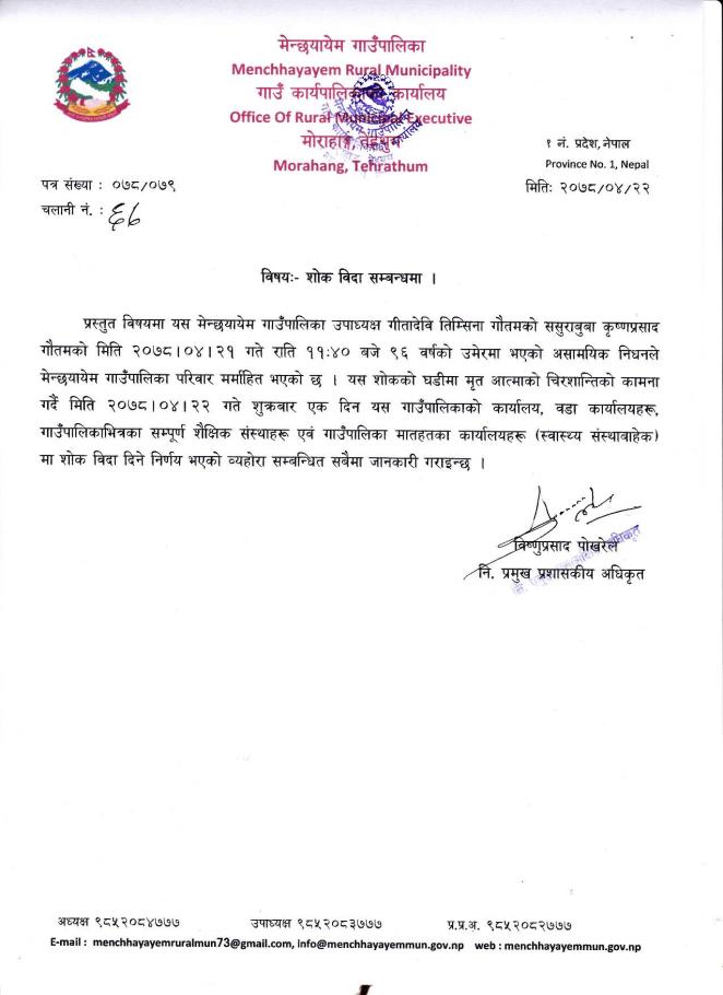 प्रस्तुत विषयमा यस मेन्छयायेम गाउँपालिका उपाध्यक्ष गीतादेवि तिम्सिना गौतमको ससुराबुबा कृष्णप्रसाद गौतमको मिति २०७८।०४।२१ गते राति ११:४० बजे ९६ वर्षको उमेरमा भएको असामयिक निधनले मेन्छयायेम गाउँपालिका परिवार मर्माहित भएको छ । यस शोकको घडीमा मृत आत्माको चिरशान्तिको कामना गर्दै मिति २०७८।०४।२२ गते शुक्रबार एक दिन यस गाउँपालिकाको कार्यालय, वडा कार्यालयहरू, गाउँपालिकाभित्रका सम्पूर्ण शैक्षिक संस्थाहरू एवं गाउँपालिका मातहतका कार्यालयहरू (स्वास्थ्य संस्थाबाहेक) मा शोक विदा दिने निर्णय भएको व्यहोरा सम्बन्धित सबैमा जानकारी गराइन्छ ।